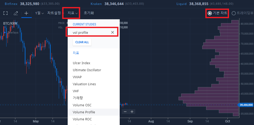 어느 가격이 매물대가 얇은지 확인 할 수 있는 지표인 vol profile 를 설명 하도록 하겠습니다.