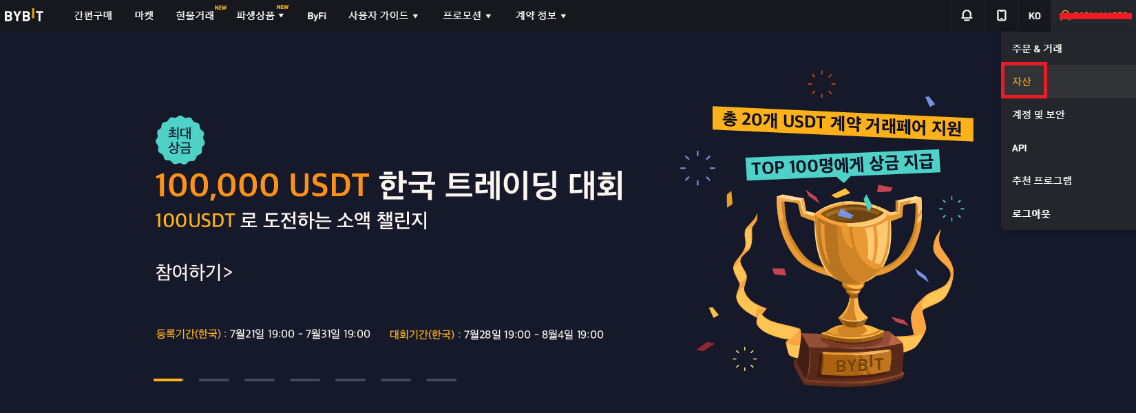 바이비트 프로필탭에 ' 자산 '에 들어가서 ' 계약 계정 ' 탭에 EOS 코인이 들어온지 확인 해야 합니다.