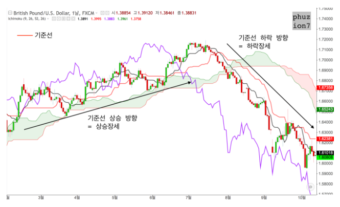전환선은 9일간 평균값으로 단기 이동평균선, 기준선은 26일간 평균 값으로